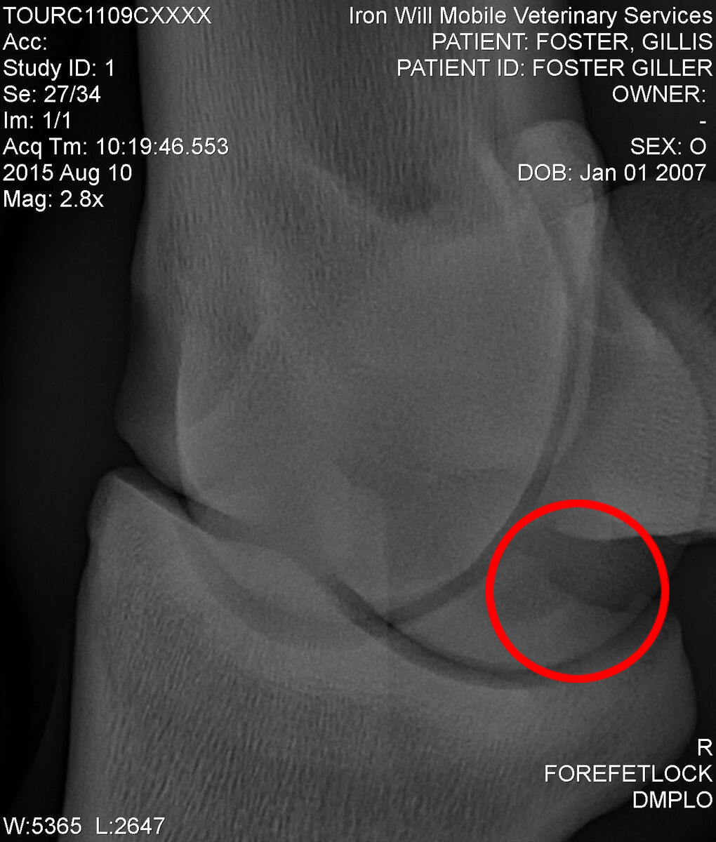 This is the first bone chip we discovered, and though it looks like it is located at the front of the fetlock, the x-ray doesn’t show depth, so surgery will show us exactly where it lies. Before going into surgery, the surgeon thought this was the one likely causing the most trauma, because you can see it is perfectly positioned to really tear up the cartilage in that joint. It may also be trying to form a cyst. Lovely.