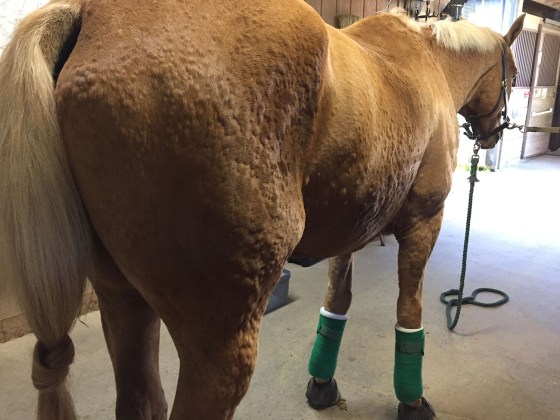 4. Oh yes, I have a mare who loves to break out in hives like this. It scares me half to death but dex and banamine always seem to help. I actually keep dex on hand because she is so prone to this, so I can dose her even before I call the vet. She’s done it for no obvious reason, once she did it after spring shots, and one time she had it in conjunction with a COPD/RAO episode (think asthma attack in a horse who is panting – not fun!). I hope Jack bounces back to his old self soon! Hang in there!