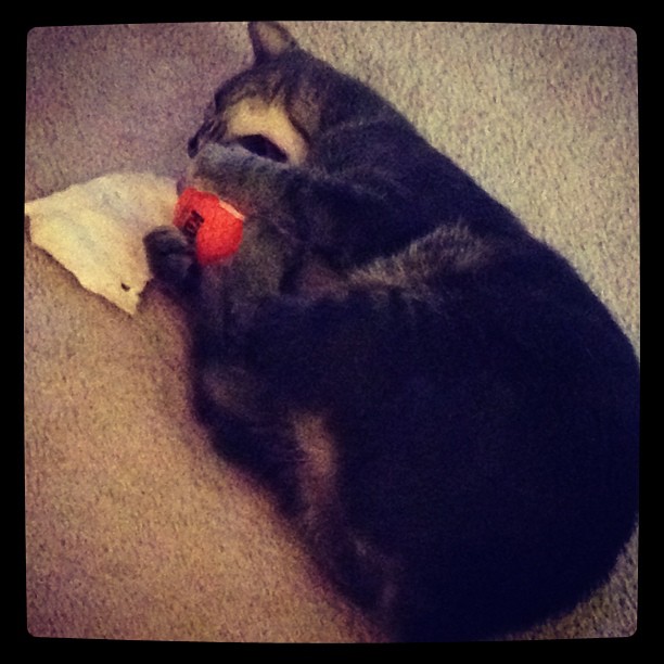 He would steal Drake’s dog toys- his ball, his bone, whatever, if he had interest. He didn’t get many toys of his own, but his favorite was a cat wand, and he would carry it around, up and down the stairs, meowing with it between his teeth as if to show it off. Like many things with Elliott, he was 150% with everything, and so we had to limit his toy time so as not to indulge him in another obsession.