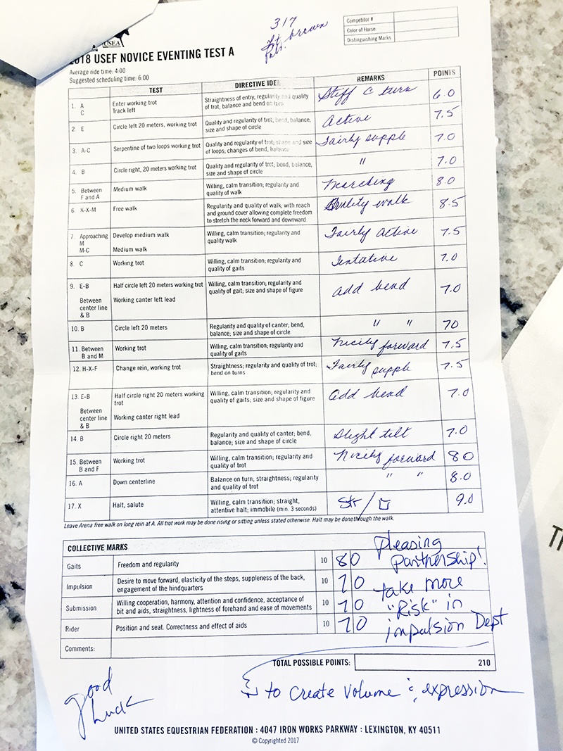 Now Jack is a spooky horse, but typically not a naughty one. And I don’t think he was being naughty per se, but he was also not listening- his brain was gone with the wind. So I spent the last couple minutes before my test on a horse that was bucking (and he never bucks), trotting sideways, bolting, jigging, and pretty much doing everything but relaxing. I did my best to hold it together in the ring, but I’ve included both my comments and the judge’s in the video below: