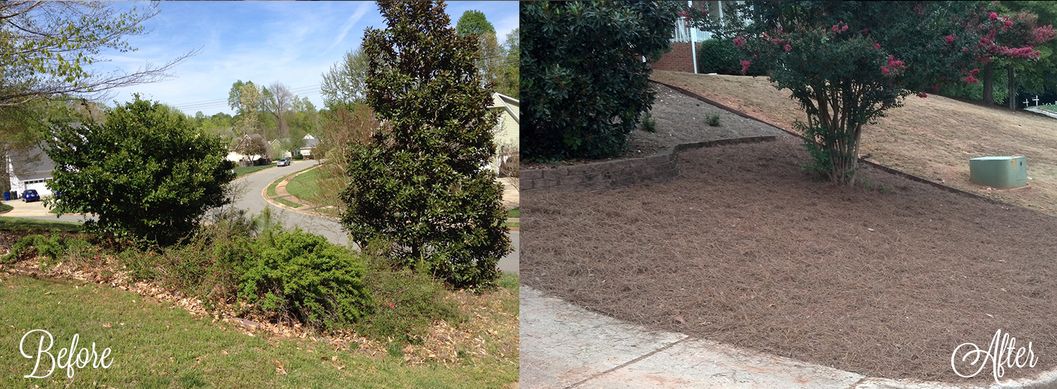 In the front we had a similar, if not worse disaster, given that all of the weeds and landscaping-gone-mad was firmly rooted in landscaping cloth. I kid you not, that stuff is meant to last and it is a PITA to get up. Many, many hours of sweat, blood, and tears later we turned it into a barren, but easily maintained pine-covered space.