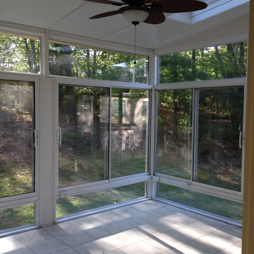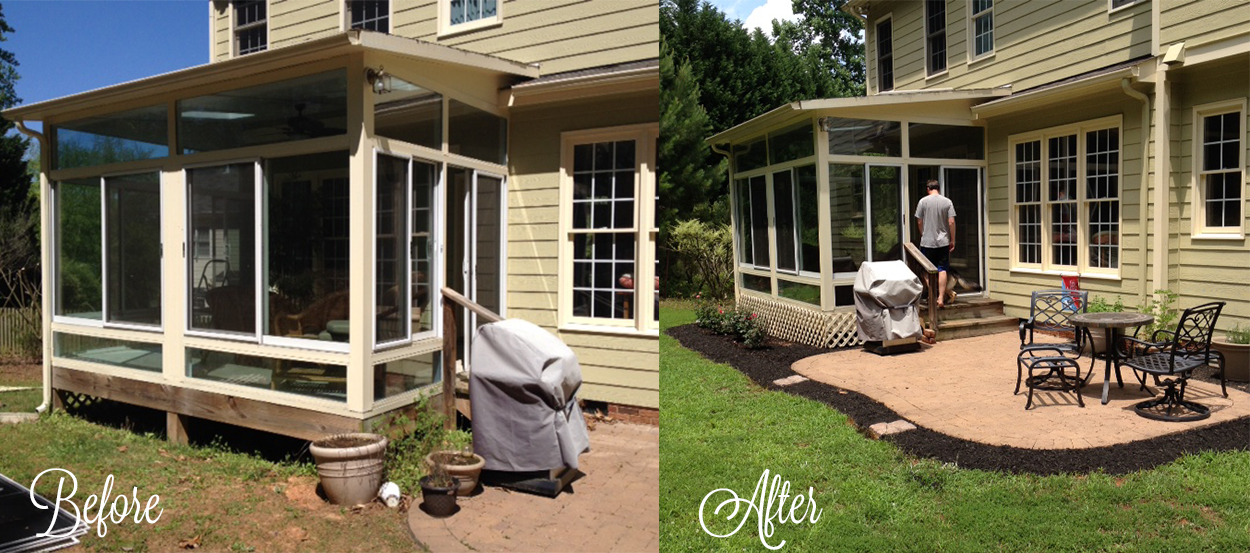 The house sits on .4 acres, and all but a tiny sliver was actually usable to us. Drake would disappear in the underbrush of the backyard so often we learned to just wait for his reappearance. I don’t have a wonderful picture of the original backyard, but you can get an idea of how dark and thick it was through the windows of this shot of the sunroom: