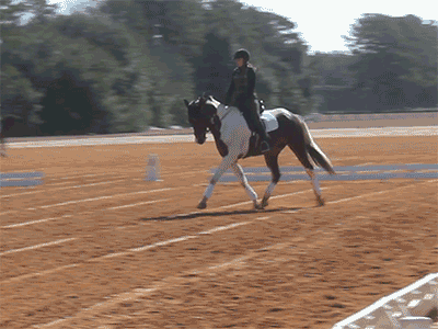 Basically the lesson was a repeat of lessons before in that there was a lot of emphasis on transitions within and between gaits, lateral work in the form of shoulder and haunches in, and more work on our lengthenings. Foster’s still figuring these out to some degree, and part of how he is dealing with the added ‘pressure’ of the lengthening is to curl under, so I’m learning how to get his poll up and keep him going, or for now, come back to the walk then try again.